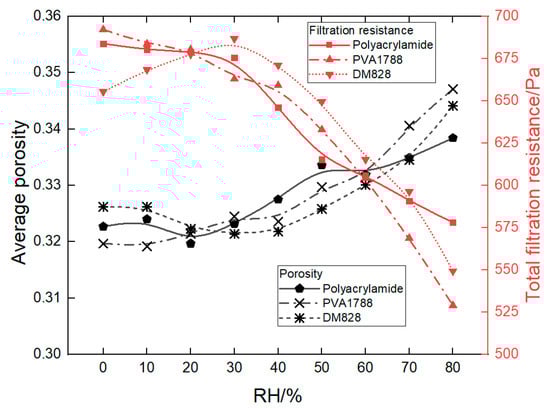 Therefore, three kinds of variations can be determined based on our findings and the literature: as the humidity increased, (1) the filtration resistance first increased and then decreased (the porosity is inversely proportional to the filtration resistance); (2) the filtration resistance decreased; and (3) the filtration resistance increased.