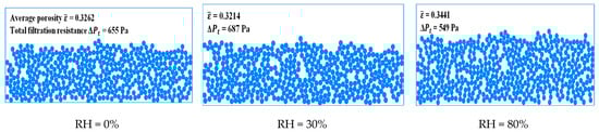 The particles on the filter material are mainly affected by the van der Waals force, the solid bridge force, the liquid bridge force, the electrostatic force and other adhesion forces. In an environment with high humidity, the van der Waals force and liquid bridge force dominate the adhesion force [], and the electrostatic force is easy to release, the influence of which can be ignored. The critical relative humidity for the disappearance of the liquid bridge force is between 60% and 80% [,,]. Thus, the upper relative humidity is considered to be 80% in this study. The increase in the adhesion between the particles will lead to an increase in the coefficient of rolling resistance and the coefficient of friction between the filter cake particles. The influence of the friction coefficient is much weaker than that of the rolling resistance coefficient [,], so this paper only considers the influence of the rolling resistance coefficient.
