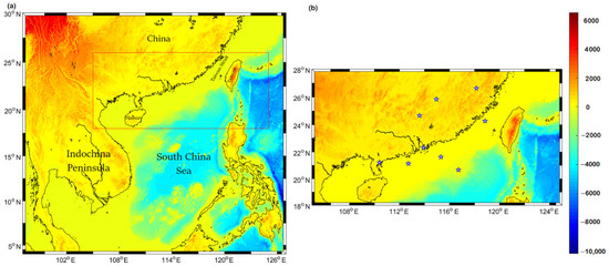 (a) Terrain and Bathymetry (m) of South China Sea and surrounding region from ETOPO2 data. (b) Southern China coast showing the shallow bathymetry. The point locations used in the following analysis are shown as blue stars.