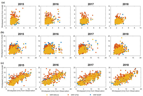 The hourly 10 m simulated wind speeds are extracted from the WRF simulations. The 10 m constrain is placed because of available long-term hourly data from the observation. The simulated results are then averaged over a day and used for the analysis. Figure 3 compares the daily average from model results with NOAA integrated surface data for the land and MERRA data for interior oceans. When comparing the simulation results, WRF simulations forced with NCEP-FNL data are represented by WRF-N, WRF simulations forced by ERA-Interim models are represented by WRF-E, and WRF simulations forced with CFSv2 models are represented by WRF-C. In this section, we have taken three locations, one along the onshore (Nanping), one along the coastal China (Hong Kong), and one at 100 km offshore of Quanzhou. Additional locations and their analysis are provided in the Appendix A (Figure A1, Figure A2 and Figure A3). The results in the Appendix A are equally valid. The model output daily averaged wind speed shows a good correlation with the observational data with narrow deviation from the diagonal favoring higher wind speed derived from the simulations. The maximum wind speeds occur in the offshore region (including sites in Appendix A Figure A1, Figure A2 and Figure A3) with overall wind speed ranging from 5 to 20 m s−1. For coastal and interior China, the wind speed is lower with a range from 2 to 10 m s−1. Along the coastal region, WRF-E has lower deviations from the one-to-one line, while WRF-N and WRF-C simulations have a significant positive bias.