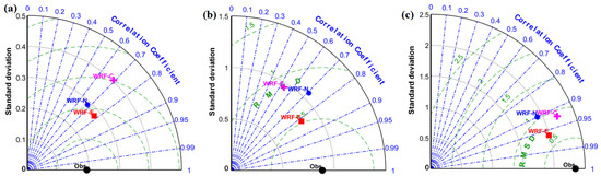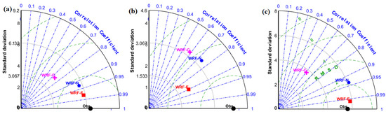 Taylor diagram for temperature in K from the models and observations at the locations (a) Nanping, (b) Hong Kong, and (c) offshore Quanzhou.