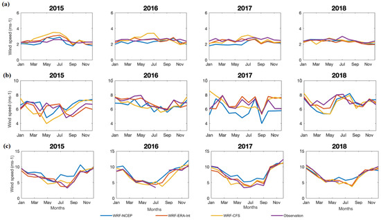 Figure 5 compares the monthly mean observed wind speed for different sites with simulations forced by three different initial and boundary conditions. Here, it is noted that the models perform well in simulating the onshore and offshore winds (Figure 5a,b) very well, but at the coastal sea, the models are inefficient in simulating the monthly winds. The monthly variations in the wind speeds are absent in the interior and far-off China but register highly in the coastal regions. The offshore region records the maximum winds in the fall and winter seasons (from October to February), while the remaining months have relatively low wind speeds. In the coastal region, the WRF-E can be seen closely matching the available observational data than the other models. Additional locations are provided in the Appendix Figure A5, Figure A6 and Figure A7.