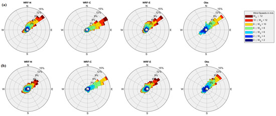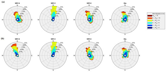 Wind rose diagram on an hourly timescale from the models and observations for the years (a) 2015 and (b) 2016 in Dongsha Island.