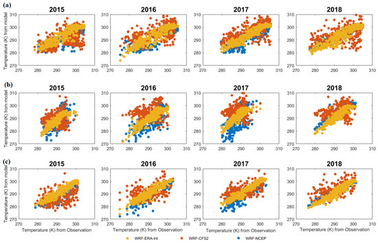 Daily average temperature in K from the models and observations at the offshore locations (a) Quanzhou, (b) Shanwei, and (c) Nansan.