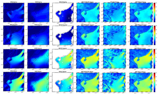 Average seasonal wind speed in m s−1 from the models and observations for all the seasons along the study area. Spring is shown in first row, summer in second row, autumn in third row and winter in fourth row. The first column represents ERA5 data, second column from NCEP Reanalysis 2, third column from QuikScat, fourth column from WRF-N simulations, fifth from WRF-C simulations and sixth from WRF-E simulations.