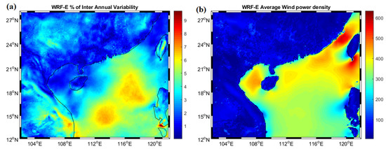 To optimize the windfarm setting, the interannual variations (IAV) of the wind speed and the average wind power density in terms of cubic windspeed using Equation (3) are examined. Since the WRF-E simulation has a better performance in reproducing the wind field characteristics, the following analysis will be mainly based on the WRF-E results. Figure 11a shows that the IAVs along the coastal region are low (<2%) and hence these regions act as an excellent region for long-term offshore wind energy investments. The open ocean has the highest interannual variations. Along the coastal regions, Taiwan Strait has the maximum average wind power density and minimum interannual variations. This region acts as an excellent region to obtain wind energy in the South China Sea. This region is also identified as one of the best regions over the globe to extract wind energy in the range higher than 600 W m−2 [63,64]. Followed by the Taiwan strait, the regions around Guangdong province and the Hunan province also share some of the highest wind power density amidst lower interannual variations in the South China Sea.