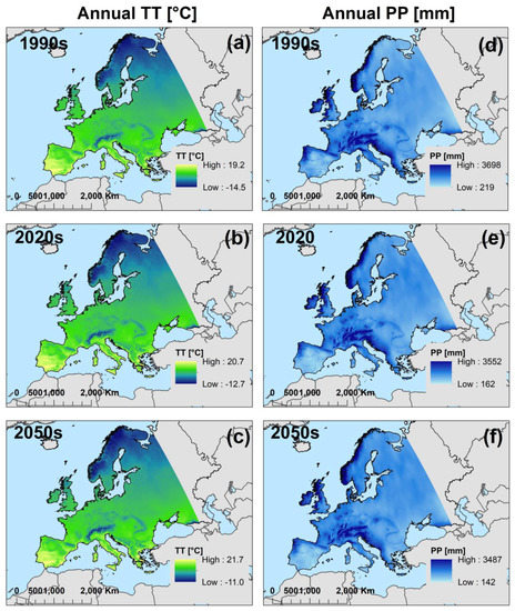 Climate variables as input data in Europe and output results list. (a) Mean annual air temperature (TT) in 1990s. (b) Mean annual air temperature (TT) in 2020s. (c) Mean annual air temperature (TT) in 2050s. (d) Mean annual precipitation (PP) in 1990s. (e) Mean annual precipitation (PP) in 2020s. (f) Mean annual precipitation (PP) in 2050s.