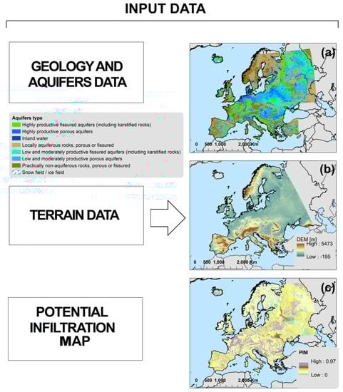 Based on the geological nature of the layers, DEM, and slope raster data maps, a potential infiltration map of Europe was created. The calculation considers higher infiltration values where the potential infiltration coefficient (PIC) is higher and the slope angle is lower. On the other hand, the infiltration values are lower where the PIC is lower and the slope angle is higher.