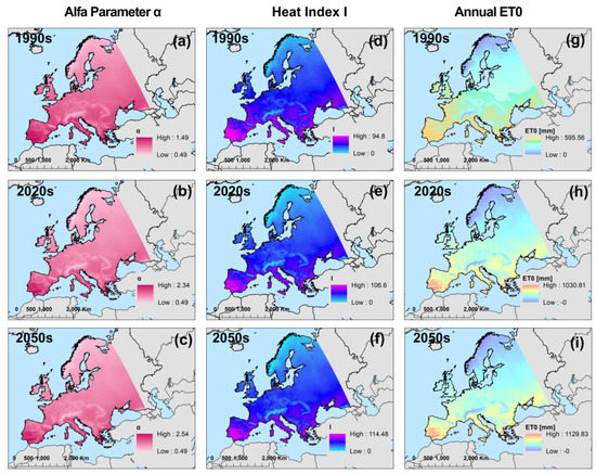 Spatial distribution of Alfa parameter (α), heat index (I), and annual potential evapotranspiration (ET0) in Europe. (a) Alfa parameter α in 1990s. (b) Alfa parameter α in 2020s. (c) Alfa parameter α in 2050s. (d) Heat index I in 1990s. (e) Heat index I in 2020s. (f) Heat index I in 2050s. (g) Annual ET0 in 1990s. (h) Annual ET0 in 2020s. (i) Annual ET0 in 2050s.