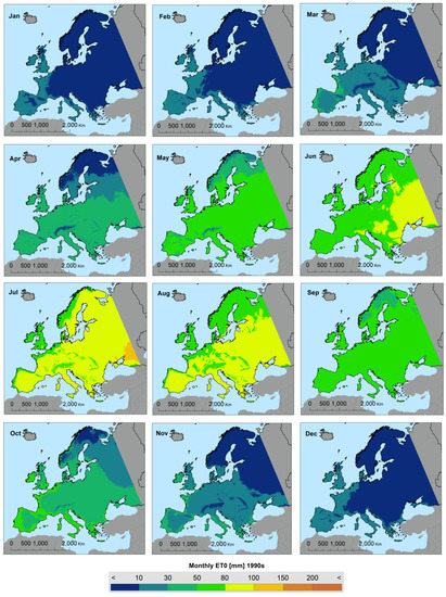 The monthly potential evapotranspiration (ET0) in Europe during 1990s–2050s was calculated using the Thornthwaite approach [34]. Despite being an older method for the determination of potential evapotranspiration, this approach is still very useful for hydrological studies and for long-term period [32,35,36,37]. In Europe, the monthly ET0 varied from 0 mm to 250 mm during the 1990s, with the higher values in July and August (over 200 mm) and lower values in the months of January, February, March, November and December. Figure 4 shows the monthly ET0 over the European continent during the 1990s.