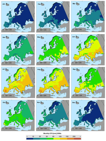 It is important to notice that increases in the value of monthly ET0 were identified mostly in the summertime months of June, July, and August as well as during May and November during the 1990s, the 2020s, and the 2050s. The spatial distribution of the monthly ET0 shows major changes in Southern, Eastern and Western Europe. Minor changes were identified in the months of January and December during the three periods, with non-significant spatial changes in the North of Europe and in the mountainous areas.