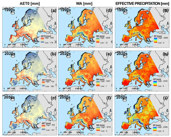 Variables list as input data in Europe and output results including actual evapotranspiration, (AET0), water availability (WA), and effective precipitation. (a) Actual evapotranspiration AET0 in 1990s. (b) Actual evapotranspiration AET0 in 2020s. (c) Actual evapotranspiration AET0 in 2050s. (d) Water availability WA in 1990s. (e) Water availability WA in 2020s. (f) Water availability WA in 2050s. (g) Effective precipitation in 1990s. (h) Effective precipitation in 2020s. (i) Effective precipitation in 2050s.