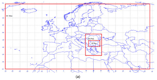 The large-scale (background) meteorological data used in the study were taken from the ‘NCEP Global Analysis Data’ with a horizontal resolution of 1° × 1°. Using the ‘nesting’ capabilities of the WRF and CMAQ models, a resolution of 9 km was achieved for the territory of Bulgaria by sequentially solving the task in several consecutive, nested areas (Figure 1a).