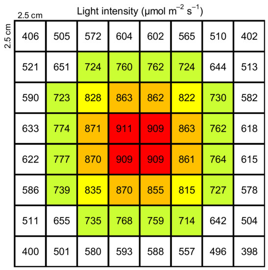 Distribution of photosynthetic photon flux density (PPFD, μmol m−2 s−1) at the base of water bath tank during exposure to an LED light source. (Red-filled cells stand for PPFD larger than 900 μmol m−2 s−1; orange-filled cells stand for PPFD ranged from 850 to 900 μmol m−2 s−1; yellow-filled cells stand for PPFD ranged from 800 to 850 μmol m−2 s−1; green-filled cells stand for PPFD ranged from 700 to 800 μmol m−2 s−1; white-filled cells stand for PPFD less than 700 μmol m−2 s−1.