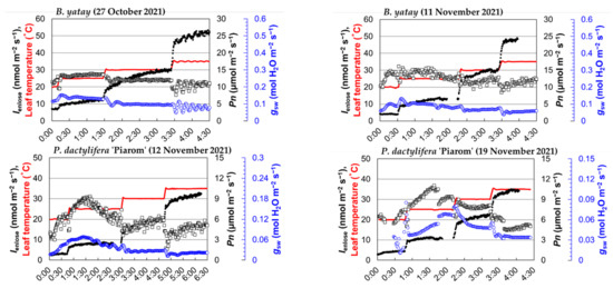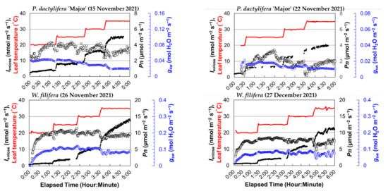 By contrast, the palm species exhibited relatively stable variation in Pn, but large differences appeared between species. The Pn value of palm leaves typically reached a maximum at 20 or 25 °C and, then, decreased slightly at higher leaf temperatures. The steady-state Pn values of B. yatay were 10.9–13.8 and 12.2–13.8 μmol m−2 s−1 in the two measurements. Those of P. dactylifera ‘Piarom’ were 5.2–6.7 and 5.2–9.4 μmol m−2 s−1; those of P. dactylifera ‘Piarom’ were 3.6–4.1 and 0.6–2.4 μmol m−2 s−1; those of W. filifera were 9.2–10.5 and 7.1–8.2 μmol m−2 s−1.