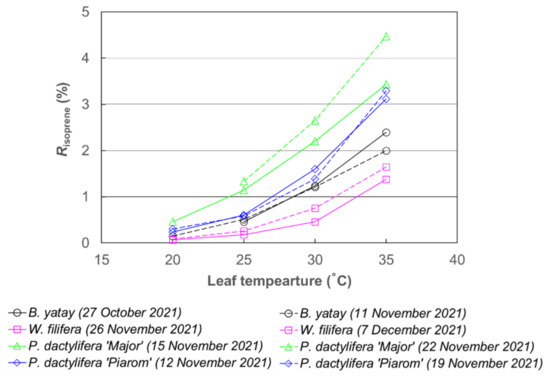 For all the palm species (B. yatay, W. filifera, P. dactylifera ‘Major’, and P. dactylifera ‘Piarom’), Ienclose clearly depended on temperature. Differences among species were relatively small at 20 °C and increased at higher temperatures. The nonlinear increases in Ienclose from 20 to 35 °C for the palm species were generally consistent with the temperature dependence reported in previous studies [48,49,50]. By contrast, the Pn values of the palms exhibited varying responses to leaf temperature, increasing when the leaf temperature increased from 20 to 25 °C but decreasing at higher temperatures. The decrease at high temperatures is attributed mainly to decreasing gsw. Risoprene of the palm species increased significantly with leaf temperature because of the decrease in Pn and substantial increase in Ienclose, which is consistent with the pattern of hybrid aspen (Populus tremula × Populus tremuloides) reported by Rasulov et al. [51]. In addition, species such as P. dactylifera ‘Major’ and P. dactylifera ‘Piarom’ exhibited extremely high Risoprene (>3%) at a leaf temperature of 35 °C in this study compared to those recorded from hybrid aspen.