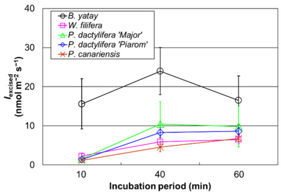 The Iexcised values of B. yatay, W. filifera, P. dactylifera ‘Piarom’, P. dactylifera ‘Major’, and the sunlit P. canariensis individual were measured for incubation periods of 10, 40, and 60 min (Figure 4). The isoprene emission rate of B. yatay increased as the incubation period increased from 10 to 40 min and, then, decreased at an incubation period of 60 min. The Iexcised values for periods of 10 min (15.6 ± 6.4 nmol m−2 s−1) and 60 min (16.5 ± 6.3 nmol m−2 s−1) were approximately 65% of that at 40 min (24.0 ± 6.0 nmol m−2 s−1). For W. filifera, P. dactylifera ‘Piarom’, and P. dactylifera ‘Major’, Iexcised increased as the incubation period increased from 10 min (2.3 ± 0.6, 1.4 ± 0.2, and 1.6 ± 0.2 nmol m−2 s−1, respectively) to 40 min (5.9 ± 1.2, 8.3 ± 1.3, and 10.5 ± 5.7 nmol m−2 s−1, respectively). The value for a period of 60 min was approximately the same level as that of 40 min (6.5 ± 1.1, 8.7 ± 0.9, and 9.8 ± 5.2 nmol m−2 s−1, respectively). P. canariensis exhibited a constant linear increase in Iexcised with increasing incubation period during the entire experiment, where Iexcised was 1.2 ± 0.1, 4.6 ± 1.2, and 6.7 ± 0.7 nmol m−2 s−1 after 10, 40, and 60 min, respectively. Iexcised was typically low in the initial stage and increased at 40 min for all the palm species; however, the tendency after further incubation depended on the species.