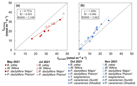 Comparison of isoprene emission rates obtained by the enclosure method (Ienclose) and the method using excised leaves (Iexcised) for multiple palm species at water temperatures of (a) 30 °C and (b) 25 °C. Solid lines represent linear regression between Ienclose and Iexcised, where the intercept value was set to zero. (RMSE: root mean square error).