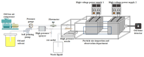 Figure 1 illustrates the experimental setup for catering oil droplet with electrostatic methods. The oil droplet was produced by high-pressure nozzle, and the droplet size could be adjusted by the nozzle pressure and the volume ratio of oil and organic solvent. The working pressure of the nozzle could be adjusted between 4–6 Mpa (40–60 kg). The 0–20 kV voltage was supplied by high voltage DC power supply (Pintech PA1030, Shenzhen, China). The concentration of the simulated cooking fume before and after treatment was measured by portable oil fume detector (TW-3068, Qingdao, China). The droplet size distribution was detected by spray particle size analyzer (Malvern Spraytec, Malvern, UK).