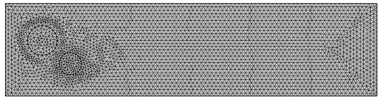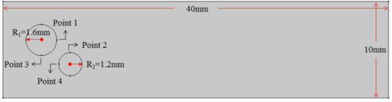A two-dimensional finite element model was established by using COMSOL MultiphysicsTM to investigate the effects of voltage, flow speed and oil droplet radius on the change process of oil droplets. The model consisted of three parts, including a 40 mm × 10 mm rectangle, a large circle with a radius of 1.6 mm, whose center distance from the boundary was 4 mm and 6 mm, and a small circle with a radius of 1.2 mm, whose center with a distance of 7 mm and 3.5 mm, respectively. There were four measuring points on two circles, which were marked as points 1–4, respectively. The geometry of the model is shown in Figure 2.