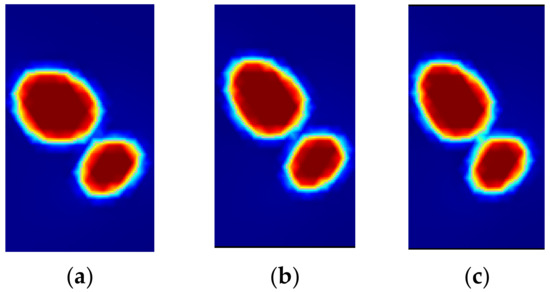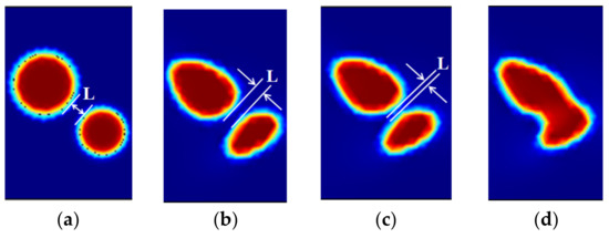 In this paper, the effect of oil droplet radius on oil droplets’ coalescence was also simulated as shown in Figure 8c. Setting the flow speed as 0.5 m/s, and the radius of two oil droplets as 1.8 mm and 1.4 mm, 1.6 mm and 1.2 mm, respectively, the two oil droplets with the larger radius would acquire greater electric field force, which would promote them to being close together and make them easier to coalesce, which could then significantly enhance the coalescence speed.