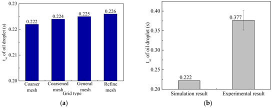 As voltage was set as 10 kV, the influence of flow speed on tsc by computer simulation is shown in Figure 8b. When the flow speed was dropped from 0.04 m/s to 0.1 m/s, tsc decreased from 0.468 s to 0.123 s rapidly. Then the downward trend became gentle when the flow speed ranged from 0.1 m/s to 0.2 m/s. This notable difference might be attributed to the carrying effects on the oil droplets by the gaseous fluid with a higher flow speed, which would exacerbate the distortion of the oil droplets and speed up the oil droplets’ coalescence. When the flow speed was further increased to 0.5 m/s, the contact time between the oil droplets was too short and the interaction force between them was weakened, which made it difficult to promote oil droplets’ condensation.