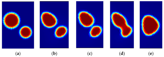 Oil droplet coalescence process under the coupling of electric field and flow field. (a) 0 s, (b) 0.1 s, (c) 0.2 s, (d) 0.3 s, (e) 0.4 s.