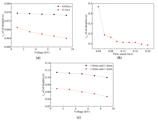 When the flow speed was 0.03 m/s and 0.1 m/s, tsc at different voltages (1–9 kV) are shown in Figure 8a. As stated in electrostatics theory [40], under the action of an electric field, the electric stress at the fluid interface pulls the oil droplets along the direction of the electric field, which might promote the coalescence of oil droplets. Thus, higher voltage meant the more obvious effect of the electric stress. When voltage was increased from 1 kV to 9 kV, the gathering speed was quickened, and tsc was shortened from 0.069 s to 0.064 s with 0.1 m/s flow speed. Meanwhile, the greater the flow speed was, the faster the oil droplets coalesced.