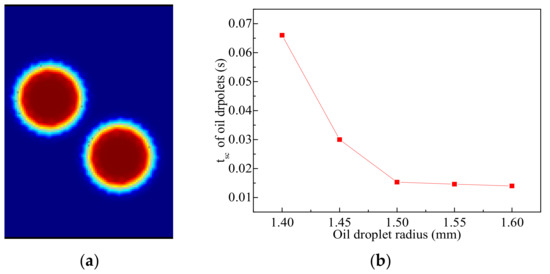 In addition, the two oil droplets with the same diameter were placed in the simulated electric field to further investigate the impact of radius on coalescence process, as shown in Figure 9a. The oil radius was increased to a 0.05 mm interval, with 10 kV voltage and 0.5 m/s flow speed, and the correlation curve of the oil droplets’ coalescence time with oil droplet radius is shown in Figure 9b.