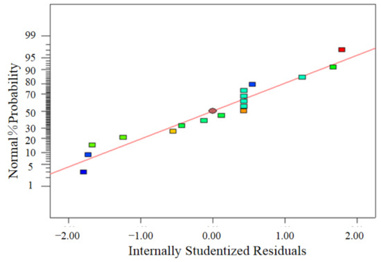 On the whole, the experimental values are distributed around the predicted values in Figure 10, which indicates that the actual values were similar to the predicted values. The accuracy of model fitting was verified.