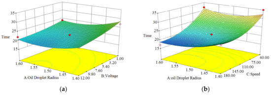 Figure 11a shows the effect of the interaction of the radius and voltage on tsc at a speed of 110 mm/ms. When the voltage was set as a constant, tsc increased slightly with the decrease in radius. When the radius of an oil droplet was fixed, the voltage decreased and tsc increased. The curves on the bottom surface were flatter and showed a slight upward trend as the influence factor increased. The increase in voltage made the oil droplets subject to greater electrical stress. However, with the increase in radius, the volume of the oil droplets became larger and the force was dispersed. Therefore, the coalescence of the oil droplets was less affected by the interaction between them.