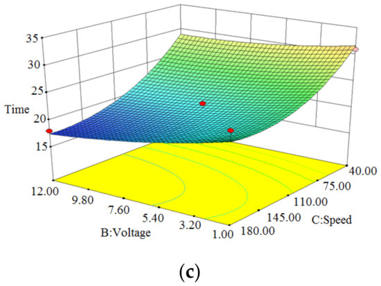 Response surface diagram of interaction of various factors. (a) Radius and voltage, (b) radius and speed, (c) voltage and speed.