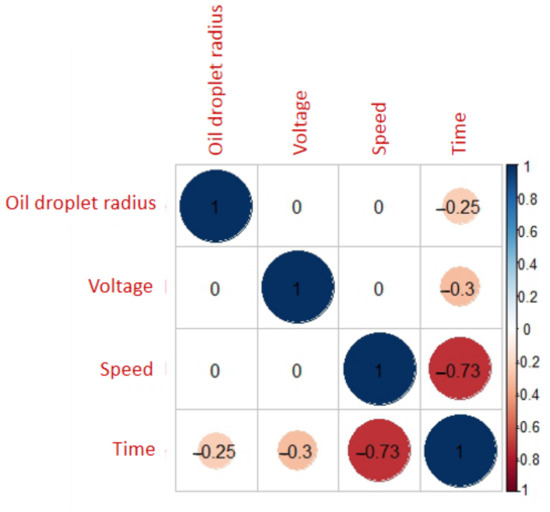 In summary, the effect of the interaction of voltage and speed on tsc was similar to that of radius and speed. The interaction of oil droplet radius and voltage had a weak effect on the coalescence of oil droplets. The influence degree of each factor was speed > voltage > radius of oil droplet.