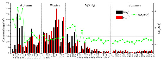 - High concentrations of the gaseous pollutants SO2 and NO2 appeared in winter, and O3 had the highest concentration in summer. The mass concentration of WSIs in winter accounted for 63.06% of the PM2.5 mass concentration, which was the highest in the four seasons. SO42−, NO3−, and NH4+ were the main water-soluble ions. according to the ratio of NO3−/SO42−, the Urumqi stationary pollution emission source contribution was dominant.