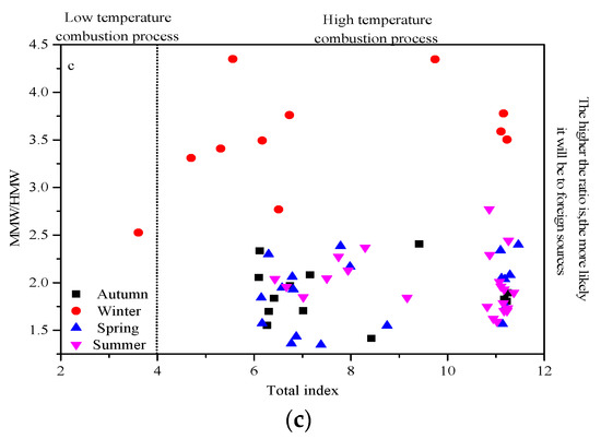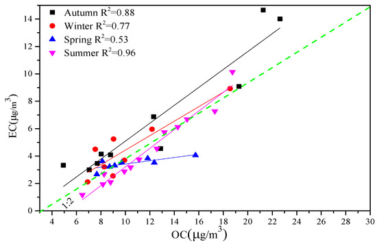 - The mass concentrations of OC and EC in autumn were higher than in other seasons, which may have been mainly caused by the open-air burning of biomass in surrounding farmland in autumn. The ratios of OC/EC in the three seasons of winter, spring, and summer were greater than 2, indicating the formation of SOC. The seasonal distribution of WSOC is as follows: winter (8.60 ± 3.00 µg/m3) > autumn (6.60 ± 2.64 µg/m3) > spring (4.30 ± 1.41 µg/m3) > summer (3.99 ± 1.52 µg/m3).