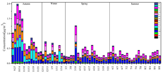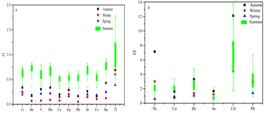 - The seasonal distribution of metal elements in PM2.5 in Urumqi was: autumn > winter > spring > summer. Al and Fe were the most abundant elements in the PM2.5. There were seasonal differences in the enrichment factors of Ni, Cu, Zn, Cd, Pb, and especially Cd, which was high in every season, mainly due to anthropogenic sources.