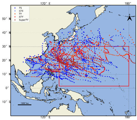 Bounding box (red box) of ERA5 for model construction and targeted TC tracks. TS: Tropical Storm; STS: Severe Tropical Storm; TY: Typhoon; STY: Severe Typhoon; SuperTY: Super Typhoon.