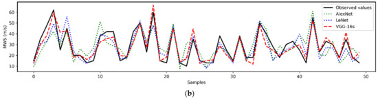 The estimation metrics of different models when predicting three selected targets are shown in Table 3. Generally, VGG-16s achieved a better prediction performance with three targets than the other two models. Especially in comparison to LeNet-5, the R2 of VGG-16s increased by 33%, and RMSE, MAE, and SMAPE of VGG-16s, respectively, reduced by 30%, 36%, and 36% for the MCP forecast. In terms of predicting MWS, the improvements shown on four indices (R2, RMSE, MAE and SMAPE) are 31%, 35%, 41%, and 39% compared to LeNet-5. Figure 3 shows the comparison between the observed values and prediction results of MCP and MWS from three models. It was found that the prediction results of VGG-16s (the red dashed lines) are closer to the observed values (the black solid lines) than the prediction results of LeNet-5 and AlexNet, which are consistent with the metrics results. Such improvements indicate that deeper layers could help the model capture more details and can deal with multi-channels consisting of various factors.