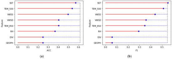 Performance comparison results of models stimulating TCI trained with certain predictors. (a,b) show the performance results in ACC and F1, respectively. Red solid lines show the values of estimation metrics. Grey dashed lines show the performance of control models inputting all predictors. Blue dotted lines show the difference of performance between the control model and the experimental model.