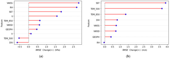 The sensitivity results are shown in Figure 5 and Figure 6. The results show that SST, VWSS, and TEM_500 are the top three important factors in TCI predictions. VWSS, RH, and SST make the most contributions to MCP among the selected factors. SST, TEM_500, and TEM_850 are the top three factors exhibiting closer relations to MWS. Common features can be found in the sensitivity results among three targets. Firstly, SST is a critical variable for three targets, which is due to the fact that ocean potential heat is a crucial energy resource to the formation and enhancement of TC. Generally, a high SST can be seen as a signal that a large amount of water in the ocean evaporates into the atmosphere, which is favorable to a low-pressure center and intensifying TC [23,31,32]. Secondly, TEM_500 is important for both MWS and TCI. This can be attributed to the moisture budget and heat exchange. When wet air mass rises, it releases latent heat that warms the surroundings to keep a warm core. After that, dry air continues rising and become colder. Therefore, the lower the upper air temperature, the more latent heat is released at around 500 hPa, which is possibly similar to the characteristic of outflow temperature [33,34]. Thirdly, VWSS has a high sensitivity to MCP and TCI, which is potentially related to the ventilation effect [35]. A deeper VWS may induce the upper and lower layers of TC to be in different phases, disrupting the energy transport and weakening the warm core. Consequently, a high VWSS is not conducive to TC intensification and is usually seen as a key factor impeding the development of TC. Furthermore, VWS is of great significance to MCP, which suggests that VWS may more directly influence a low-pressure center. Additionally, it is noted that GEOPH is not quite vital to the predicted three targets, especially to TCI and MWS. A possible explanation is that GEOPH is more likely to impact TC track than intensity [36]. Moreover, some differences are expected among three targets, particularly between MCP and MWS. This result indicates that RH is more important to MCP than the other two targets. Statistical data show that TC rapid intensification cases have higher values of 850~700 hPa relative humidity [37]. Areas with a high RH may imply violent evaporation, strong air–sea interaction cycle, and deep lowering of the pressure field [32]. In contrast, vertical temperature distribution is significant for MWS. However, a few previous works focused on the relations between temperature at certain layers and MWS. Therefore, this problem must be further investigated by numerical models.