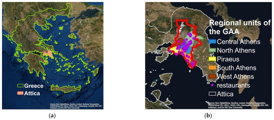(a) Map of Greece and the Attica region and (b) the restaurants participating in the survey, spatially allocated in the regional units of Attica.