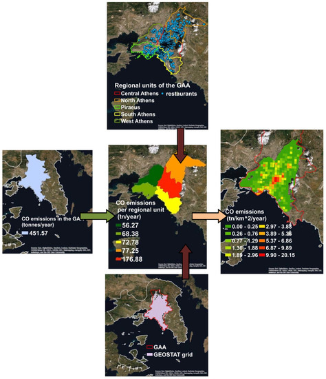 In order to perform in depth study regarding the impact of emissions on the local air quality, it is necessary to spatially disaggregate the values calculated for the GAA on a finer scale and in gridded form, especially for applications with chemical transport models. Thus the annual emissions were allocated at the five regional units of the GAA, based on the number of restaurants and mobile cooking services presented at Table 1. Afterwards, the emissions of each regional unit were mapped on the GEOSTAT grid map of 1 × 1 km cells (source: https://ec.europa.eu/eurostat/web/gisco/geodata/reference-data/population-distribution-demography/geostat, accessed on 15 June 2021), by using the number of restaurants allocated in each cell (source: OpenStreetMap data retrieved on 1 December 2021 by http://download.geofabrik.de/europe/). The methodology that followed is described by Figure 2: First step (grey arrow): GAA annual total CO emissions to emissions per regional unit, proxy value: number of restaurants per regional unit (Table 1); Second step (light green arrow): regional emissions to gridded emissions, proxy values: GEOSTAT grid and shapefile with the location of the restaurants (brow arrows).For the temporal disaggregation of emissions at monthly, daily and hourly values, temporal coefficients were produced by the monthly, daily and hourly profiles of the restaurants’ operation described in Section 3.