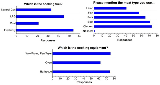 In terms of the equipment, the following three types are almost equally used by each facility (without counting the frequency of their usage): wok/frying pan/fryer (75 responses), grill (74 responses) and oven (62 responses) (83%, 82% and 69%, respectively) (Figure 3, bottom).