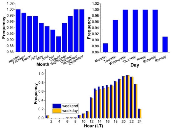 The operation of restaurants on a monthly, daily and hourly scale is shown in Figure 4. Almost all the facilities (>98%) are in full operation from October to April. A small proportion of restaurants (4–9%) in Attica remain closed from the beginning of the touristic season (May) until September, probably because the owners have another restaurant close to the coastal zone of Attica or in a touristic area. In August in particular, 9% of the restaurants participating in the survey, mostly the family businesses, are closed due to summer vacations for the owners and staff. This is the case for many other activities in Attica. The daily profile revealed that all the restaurants are open from Wednesday to Saturday, while most of them are open on Tuesday (96%). A proportion of the local restaurants are closed on Sunday (10%) because Athenians prefer to go for a walk far from the municipality that they live in. On Monday, the restaurants have a low stream of customers. As a result, 11% of owners mentioned that they prefer to provide a day off for their staff. The hourly operation of the commercial kitchens, and not the restaurants, is presented in Figure 4, bottom. This is because many cooking preparations begin before the opening of the restaurants to the public. It is obvious that very few commercial kitchens start in the morning (9:00–11:00 LT), while in almost half of them (41 responses), the cooking preparations begin at 12:00 LT, indicating that these restaurants are open for both lunch and dinner. From 13:00 LT to 17:00 LT the mean number of commercial kitchens that operate is 61, while almost all kitchens (>90%) are open from 19:00 LT to 22:00 LT, representing the peak period that customers in Greece prefer to have dinner. A total of 75% of the restaurants that serve grilled dishes have a daily operation time of about 12 h. This is consistent with the study of [40], for Athens. COA concentrations presented a 50% increase of the daily average during the lunchtime hours (12:00–15:00 LT) and a large peak at night (at about 22:00 LT). A similar diurnal profile was also recorded at the COA measurements conducted by [39]. A separation was also made in the present study for weekdays and weekends (questions 3 and 4), revealing that more facilities serve lunch on weekends in comparison to weekdays. The temporal coefficients produced by the responses to the survey are included in Table 5, Table 6, Table 7 and Table 8, following the monthly, daily and hourly profiles described previously.