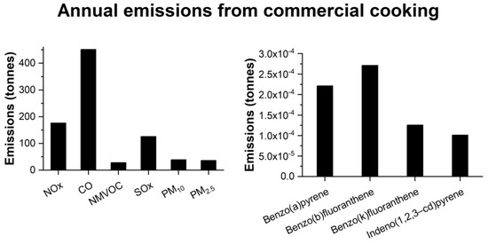 Polycyclic aromatic hydrocarbons (PAHs) should also be highlighted as an important group of pollutants formed mainly by the incomplete combustion of fuels. as well as by organic compounds such as grilled meat [27,28,29,30]. The authors in [31] found that PAH emissions from cooking activities, including both restaurants and home kitchens, were slightly lower than those from traffic sources in a representative city of Taiwan. The carbonyl composition of the cooking fumes was examined by [6] and it was found that formaldehyde and acrolein were the predominant species.
