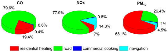 Percentage contribution of different sources (residential heating, road transport, commercial cooking and navigation) to the total emissions at the GAA.
