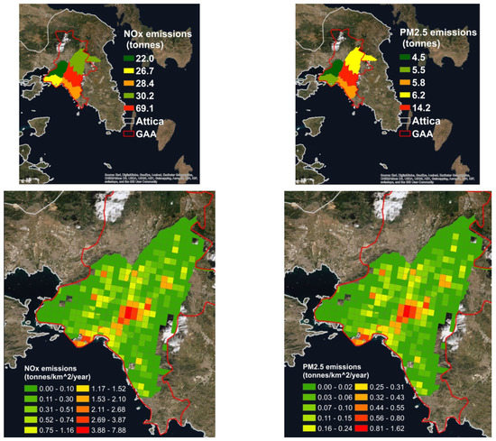NOx and PM2.5 annual emissions per regional unit in gridded form are presented in Figure 7. Higher values are attributed to the regional unit of Central Athens (69.1 tonnes for NOx and 14.2 tonnes for PM2.5) due to the fact that the majority of restaurants are located there. Many grilled restaurants also exist in the regional unit of North Athens. The maximum annual NOx and PM2.5 emissions are about 7.9 tonnes/km2 and 1.6 tonnes/km2, respectively, while lower than 1.5 tonnes/km2 for NOx and 0.3 tonnes/km2 for PM2.5 are attributed to the cells located in the regional unit of South Athens. It should be mentioned that the NOx and PM2.5 maximum gridded emissions from the other main sources in Central Athens are about 134.7 tonnes/km2 and 6.1 tonnes/km2, respectively, for road transport, and 11.4 tonnes/km2 and 17.5 tonnes/km2, respectively, for residential heating.