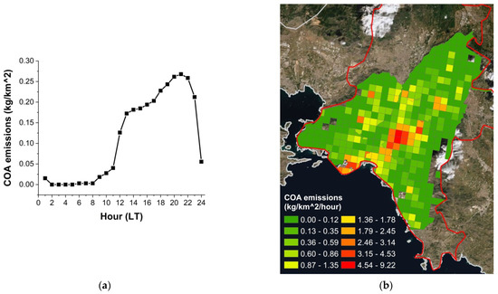 (a) The diurnal profile of COA gridded emissions (in kg/km2, for a Friday in January) for a selected cell in Central Athens and (b) the spatial distribution of COA emissions in January at 21:00 LT.