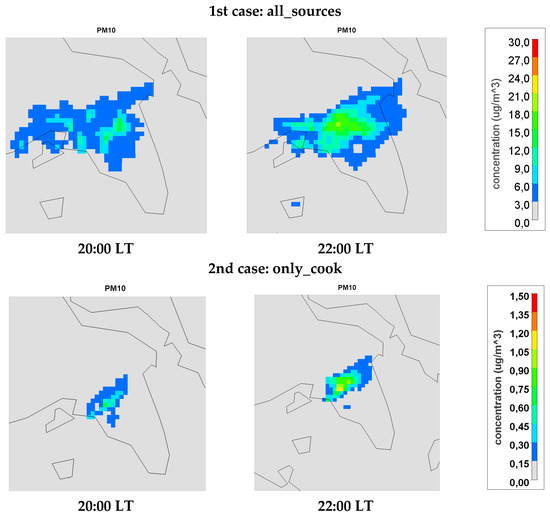 PM10 concentration dispersion at 20:00 LT and 22:00 LT at the GAA, having all emission sources (top) and only commercial cooking emissions (bottom) as input at the numerical simulations.