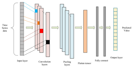 This paper adopts the basic convolutional neural network model, and the basic structure of the convolutional neural network is shown in Figure 2 below. A convolutional neural network can express the original data at a high and abstract level by the advantages of the convolution operation. It has an excellent performance in the image, signal waveform, and other fields [29]. Wind speed, air temperature, and other data are time-series data, which have local correlation, that is, data with similar times have a strong correlation. Therefore, using CNN to deal with its local features has a good effect.